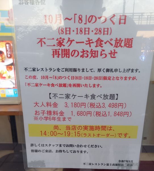 不二家レストラン リハビリの先生との話題でケーキバイキングをやっているところは? 「確か不二家レストランでやっていたよ」 そこで、調べるとケーキバイキングはなく、メニューの中にお得の物が あり、夕食に行ってきました。 入口ドアーに ![]() 一度、ケーキバイキングと言うものに行ってみたいですね。 今日、ケーキも見ましたが一つ500円前後です。6個ほど食べてトントンですね。 62.3 2897歩 漢19 |