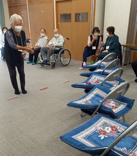 11月の寒さ おっ寒い。 ジャンバーを着る。 夜はダウンを着る。 昼間は16度ぐらい。 寒い1日でした。 寄り合い処 椅子乗せゲーム ![]() 今日のゲームはおじゃみとウチワを使って椅子に乗せるゲームです。 椅子だけだと滑って落ちてしまうので、スタッフの一人が言った座布団を敷くと 今度は満点が出て面白味が無かった。 次に椅子を7つくっつけてやる。 こちらの方が少し楽しそうだった。 62.0 4997歩 漢15 |