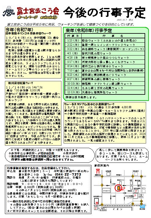 朝霧ウォーク参加者用チラシ 5月から行事参加者が60人ほどが続いています。 少しでも参加者を増やすために11日(土)の「秋の朝霧高原ウォーク」で 宣伝チラシを配布しようと三役で作っています。 今年10月、11月、12月行事と来年行事を載せた一時案を作りました。 ![]() 、pdfファイルにできなかったのでちょっと読みずらいですが ご容赦願います。 歩 漢 |
