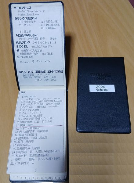 黒手帳 私はパソコンが得意ですが、スケジュールはアプリに入れていません。 昔から手帳を使っています。 そして、手帳にはいろいろなデータを書き入れてあります。 私の既往症、物覚え帳など22ページもあります。 全て使うわけではありませんがパソコン相談時にも良く使います。 今は年が変わったので、新しい手帳に移す作業をしています。 ![]() 3062歩 漢18 |