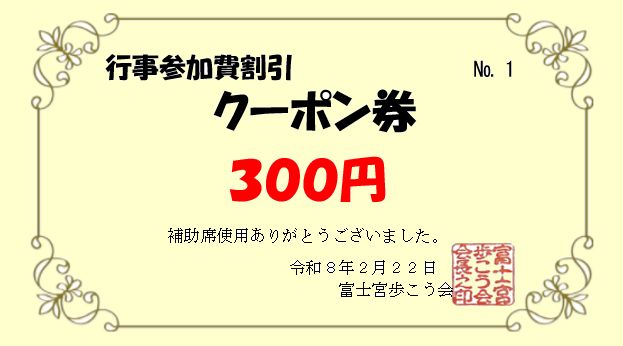 皇居一周ウォーク 補助席使用者にクーポン券 今年からバスの補助席使用された方に、300円の行事参加費割引 クーポン券300円相当を配付することになりました。 22日のウォークでも、今現在7人の方が補助席を使用することになります。 往復とも補助席だと大変さがあります。 歩こう会より気持ちですが次回以降使用できる「行事参加費割引クーポン券」を お渡しいたします。 ![]() 2985歩 漢15 |