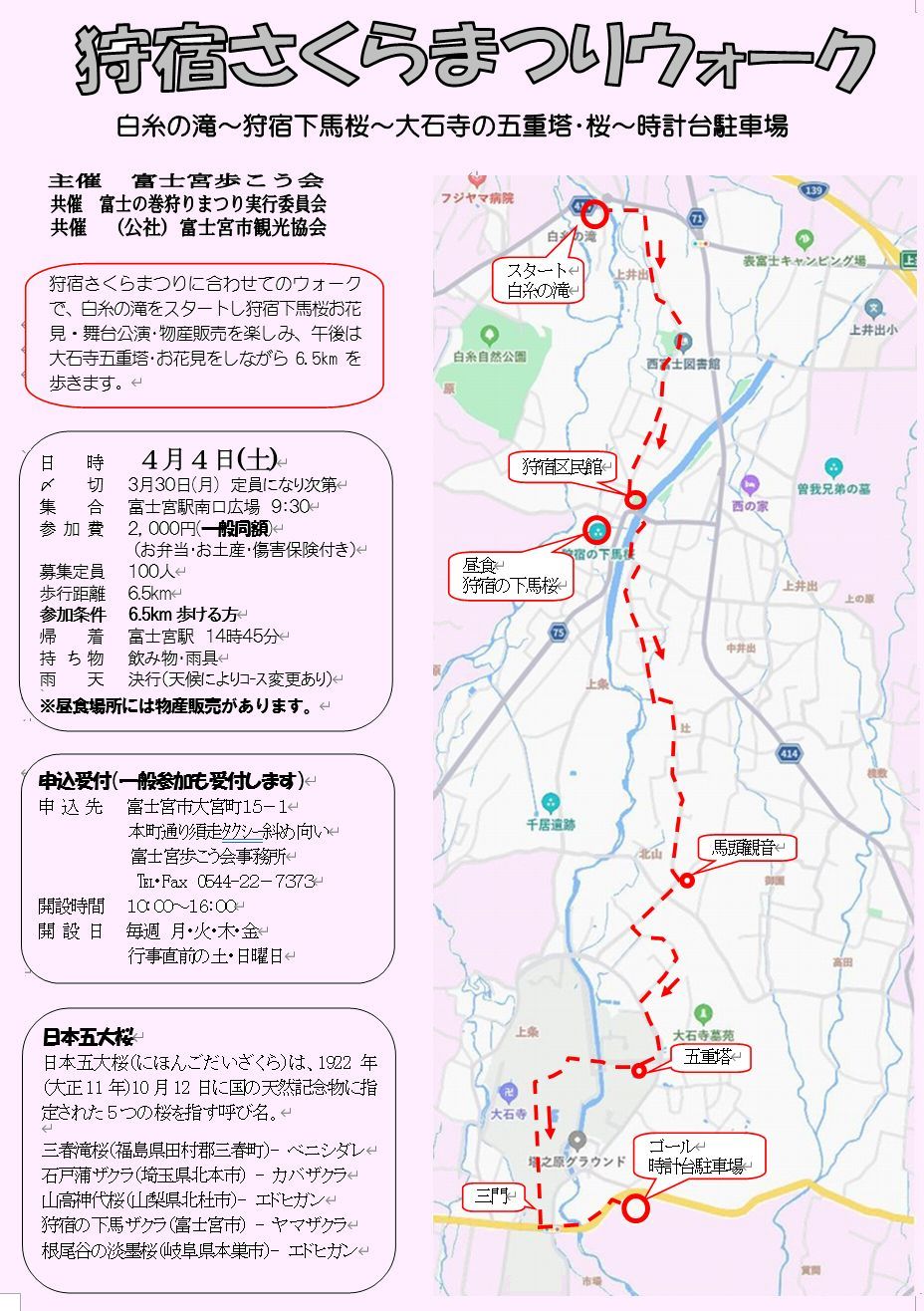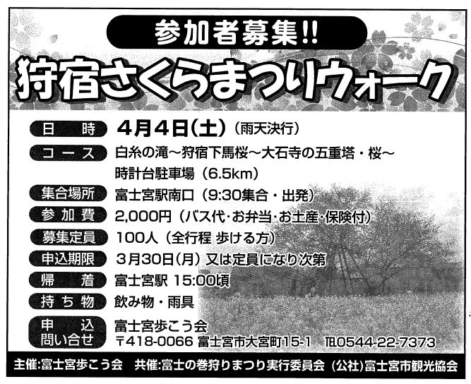 狩宿さくらまつりウォークは4月4日(土) 例年、富士宮市観光協会さんと共催して実施しています 「狩宿さくらまつりウォーク」が4月4日(土)に行われます。 ただ、翌日が歩こう会行事「笛吹川桃の花ウォーク」があります。 その事を考えまして参加をお願いします。 募集チラシは皇居ウォーク時に配付し、参加されない方には みちしるべと一緒に送付いたします。 ![]() 4410歩 漢14 |