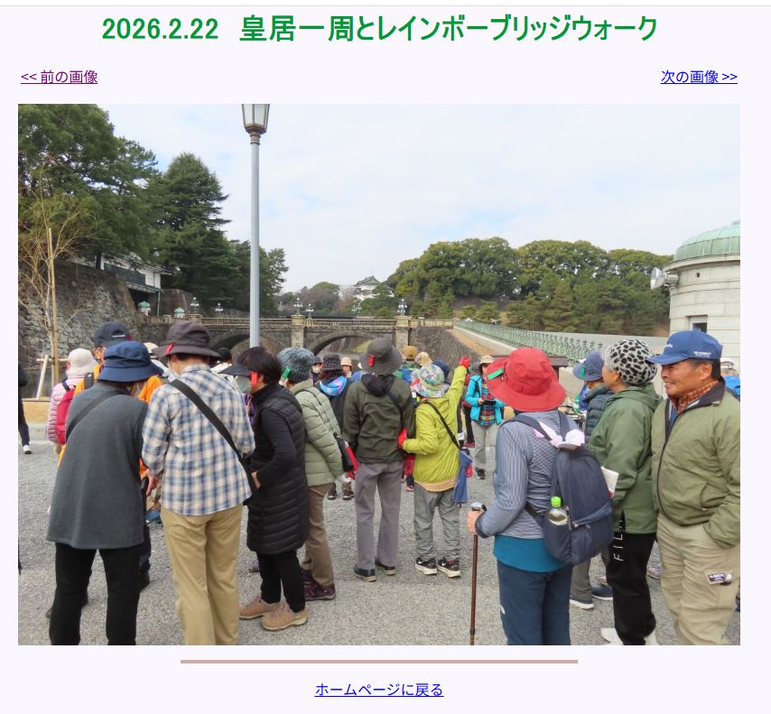 皇居一周とレインボーブリッジウォーク 申込70人 〆切11日前で申込者が70人となりました。 最近では無かったことです。 東京で皇居一周とレインボーブリッジを歩けるのがいいのでしょうか! 一般参加者も12人と多いです。 それと、もう一つ2月行事から申込者が65人以下の時は、61人~65人の方は キャンセル待ちと申込規則が変わったことも影響しているのでしょう。 最終的には80人~90人程になるのではと思います。 5615歩 漢17 |